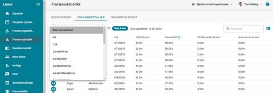 - I denne nedtrekksmenyen velger du om du vil se detaljer for dine kontaktelever, en klasse eller en gruppe