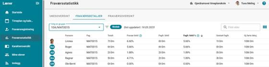 Fanen Fraværsdetaljer benyttes oftest stort sett av videregående. Grunnskoler benytter seg mer av fanen Fraværsoversikt enn denne som gir detaljert på fagnivå.