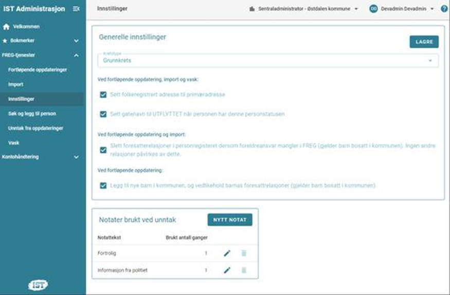 Tjenesten gir tilgang til å sette innstillinger som styrer hvordan de ulike FREG-tjenestene skal virke. (Disse innstillingene ble tidligere satt ved oppstart av hver vask eller import, mens de nå er tilknyttet et eget menypunkt / tilgangsmodul). I tillegg har brukeren tilgang til registeret over hvilke notater som skal kunne brukes ved registrering / fjerning av unntak fra oppdateringer. Det er ikke mulig å få kjørt verken Import eller Vask før ønskede innstillinger er registrert og lagret her. Pek på markeringene på bildet for forklaring av innstillingene: