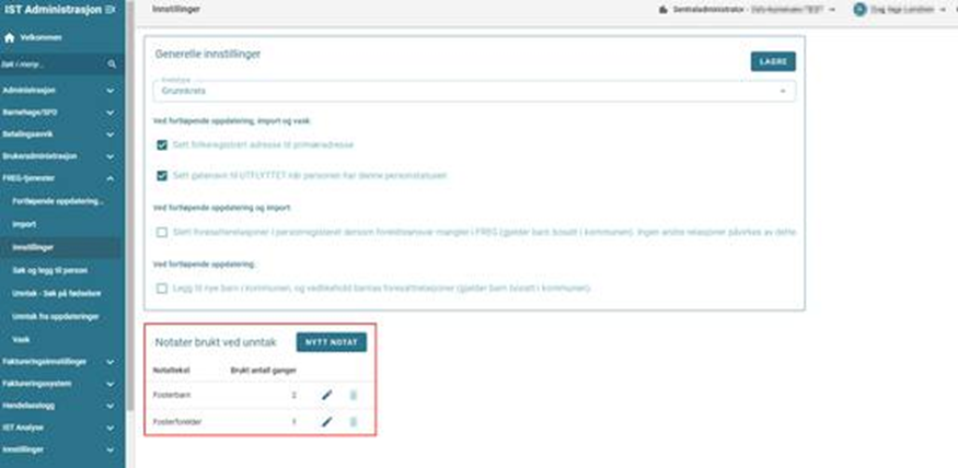 Notatet er ikke et fritekstfelt for brukerne, men de kan velge mellom notater som er opprettet her. Du ser hvor mange ganger et notat er benyttet. Notater som er benyttet kan om ønskelig endres, men det er kun notater som ikke er benyttet som kan slettes.