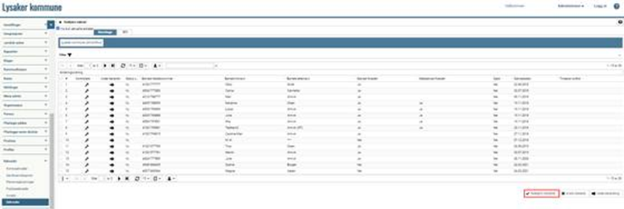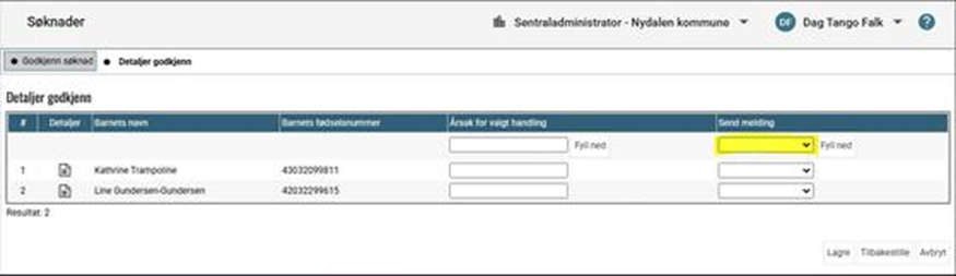 Når du trykker på knappen Godkjenn markerte kommer du til et nytt bilde hvor du ser kolonnen Send melding. Denne benyttes i forbindelse med søknad om prioritet i barnehage. Send melding benyttes ikke i forbindelse med SFO.
