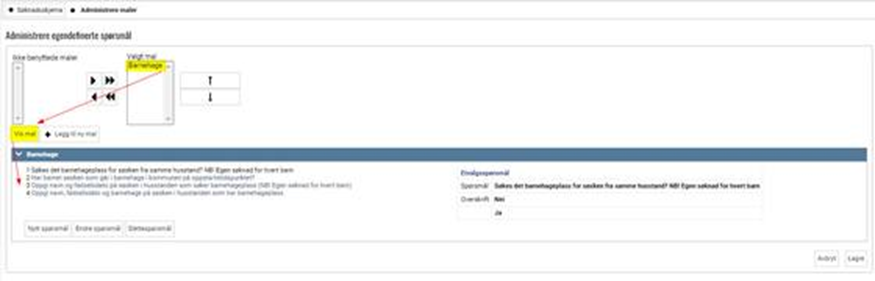 Klikk på valgt mal = Barnehage og deretter Vis mal for å se spørsmålene som benyttes