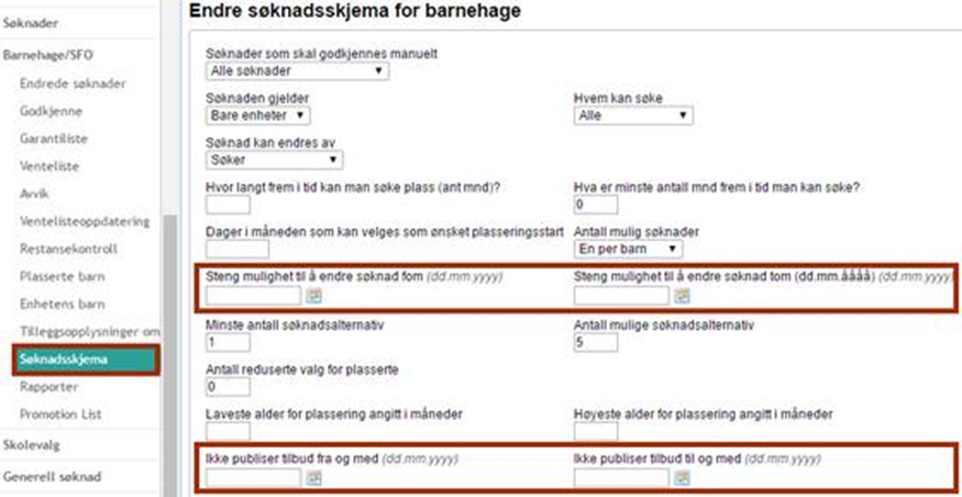 - Legg inn ønskede datoer i de to feltene «Steng mulighet til å endre søknad fom» og «Steng mulighet til å endre søknad tom» (se midt i bildet nedenfor)