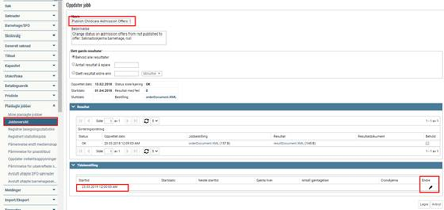 Både datoen og klokkeslettet kan endres før angitt dato/klokkeslett er nådd. Dette kan gjøres under mappen «Planlagte jobber» > «Jobboversikt» > søk frem jobben «Publish Childcare Admission Offers: Søknadsskjema barnehage» og endre ved hjelp av «endreblyanten» x 2.
