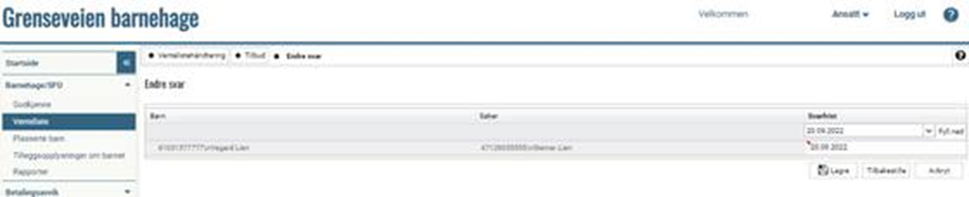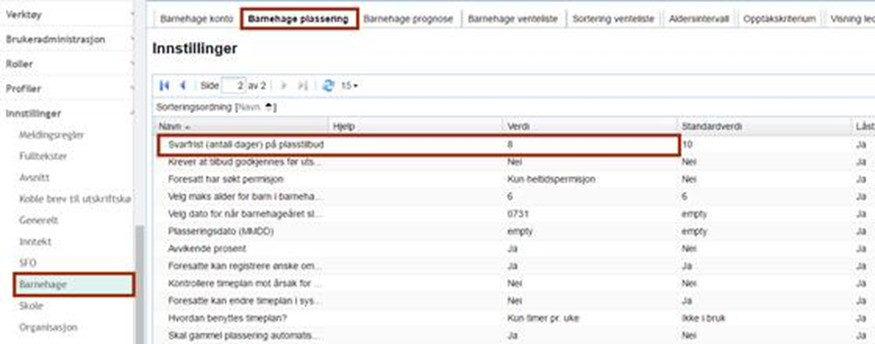 Antall dager svarfrist på tilbudsbrevene blir beregnet ut i fra eksisterende innstilling, som altså er registrert tidligere. Denne innstillingen finner du under mappen Innstillinger barnehage > fane Barnehageplassering > Svarfrist på plasstilbud.