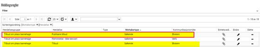 Vedrørende opprettelse av tilbud om plass i barnehage så finnes det to meldingsregler; n med hendelse Tilbud og n med hendelse Publisere tilbud. Sistnevnte meldingsregel er den som er i bruk ved samtidig publisering av tilbud (som beskrevet ovenfor under avsnittet Publisere tilbud til alle foresatte samtidig).