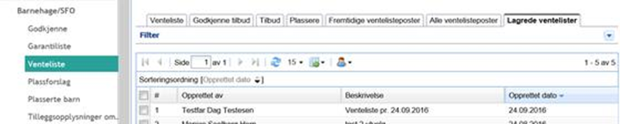 Dette kan gjentas også ved senere anledninger og alle lagrede ventelister kan altså hentes opp ved å åpne samme fane, og ved å trykke på ønsket lagret venteliste i oversikten. Du vil da få frem ventelisten slik den var den datoen/tidspunktet den ble lagret: