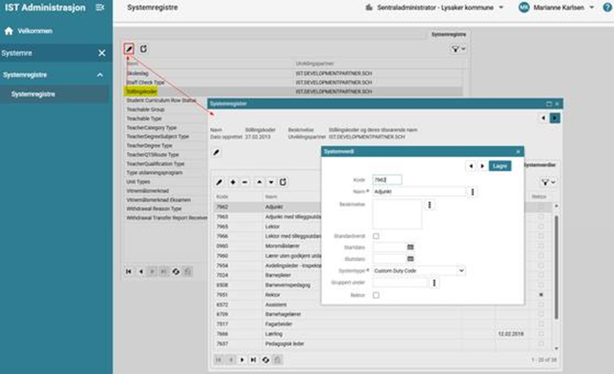 - Stå på Stillingskoder og trykk på endreikonet for å få opp registeret.