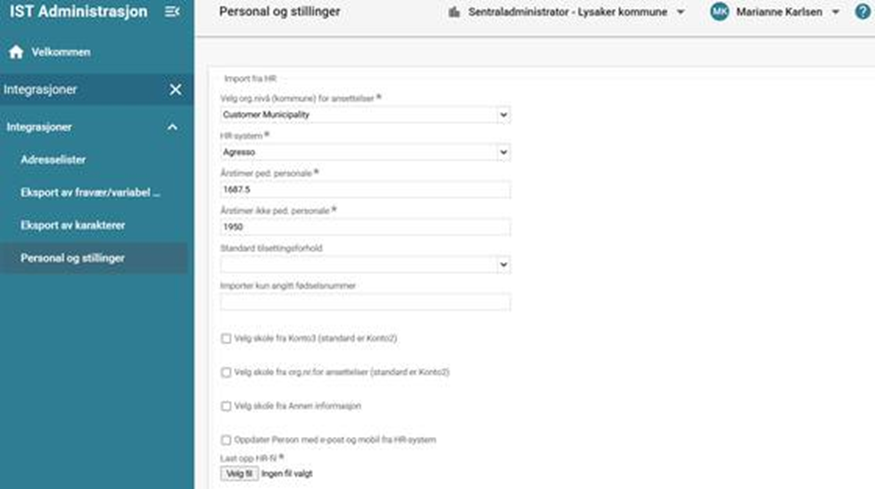 Kunden må også bestemme om de ønsker at ansattes mobiltelefonnummer og e-post adresse fra HRM skal oppdatere personkortet til de ansatte. Merk! Dette vil ved neste import overstyre eventuelle endringer gjort manuelt på personkortet til den ansatte (inkludert dersom ansatte, som også er foresatte, endrer informasjon i IST Home-app).