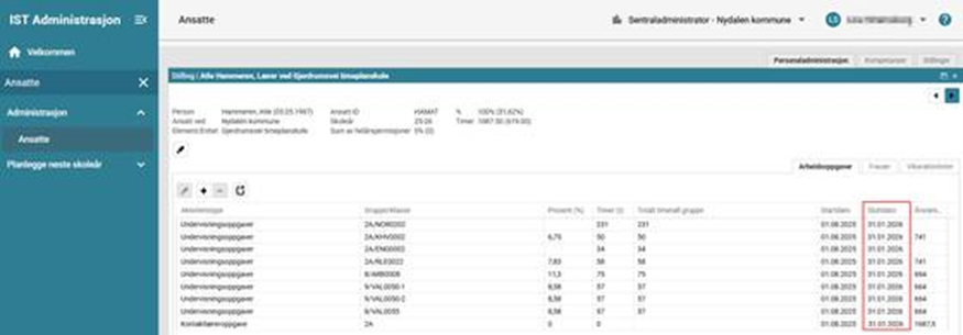 Gå til Administrasjon - Ansatte og marker stillingen som har en fått ny sluttdato. Klikk på endreikonet (i dette eksempelet er stillingen forlenget fra 31.01.2026 til 31.07.2026):