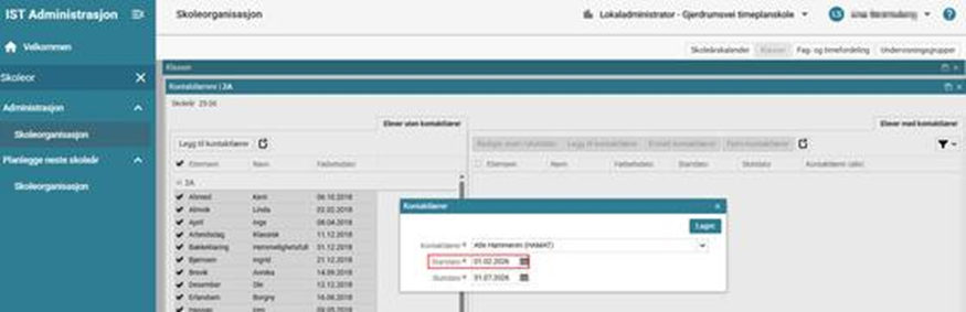Marker alle elevene som ligger under kontaktlæreren som har lærerens gamle sluttdato (i eksempelet 31.01.2026)