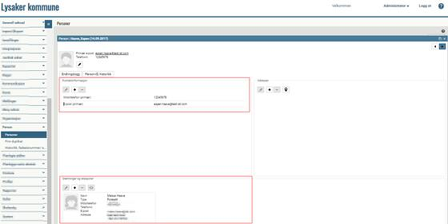 Gå til Person > Personer Søk fram vedkommende, marker og klikk på endreblyanten Under Kontaktinformasjon kan du se og endre e-post og telefonnummer, og i feltet Slektninger og relasjoner kan du endre på relasjoner. Marker det du vil endre og trykk på blyantikonet, eller legg til ny informasjon med plussknappen: