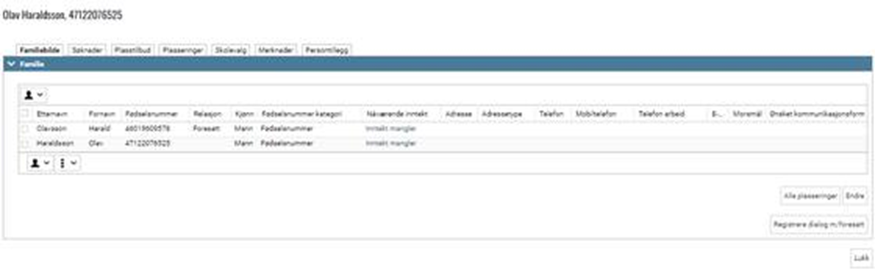 - Familiebildet er et speilbilde av relasjonsbildet i personregisteret. Trykk på Familie 1 og 2 for mer detaljer.