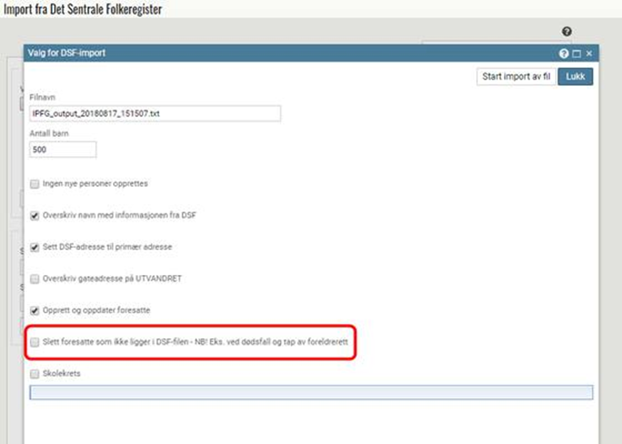 Ved innlesing fra DSF får man opp flere parametere som kan settes før innlesing av ny fil. Om man haker av for den nye innstillingen "Slett foresatte som ikke ligger i filen..." vil innlesingen fjerne de foresatterelasjonene som ikke lenger finnes med i filen som leses inn. På den måten vil de barna som nå ligger i personregisteret med foresatte, og som på nytt leses inn fra DSF med kode 4, 6 eller 7, "miste" disse foresatte i IST Administrasjon. Den aktuelle foresatte blir fortsatt liggende i personregisteret, dog uten relasjon/kobling til det aktuelle barnet. Dette gjelder også registrerte fosterforeldre. (Det er planlagt en endring på dette i importrutinen men vi avventer endringer som kommer fra sentralt hold. Informasjon vil bli gitt før den aktuelle leveranse).