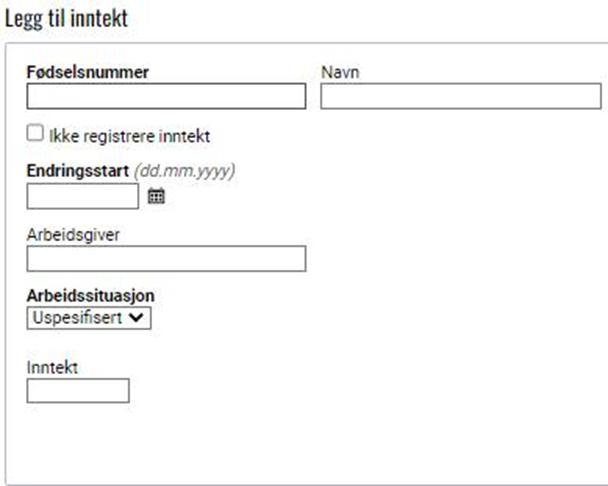 Registrer fødselsnummeret til foresatte, fra hvilken dato inntekten skal gjelde (alltid fra den 1. i en måned), arbeidssituasjon lik Uspesifisert, samt inntekten. Arbeidsgiver skal ikke registreres. «Ikke registrere inntekt» benyttes unntaksvis, f.eks. dersom en registrert inntekt ikke lenger skal gjelde / makssats skal gjelde. Når en slik søknad godkjennes, vil det bli beregnet makspris fra datoen endringen gjelder fra (Endringsstart). Merk: For at utregninger skal gjøres riktig, så må sluttdato alltid settes til den siste dagen i aktuell måned