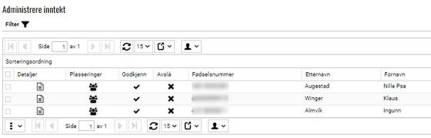 Hvis inntekten skal godkjennes, klikk på grønn hake eller merk raden og klikk deretter på Godkjenn markerte. Skriv inn gyldig Til og med-dato på inntekten. Valgt handling skal normalt stå til Fjern fremtidige inntekter. Dersom ønskelig kan man f.eks. skrive inn familiens samlede månedsavgift, vedtaksnummer e.l. i feltet Årsak for valgt handling. Klikk på Lagre.