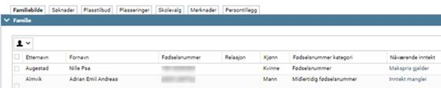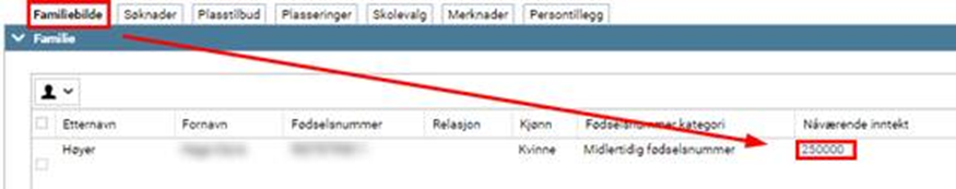 I alle familiebilder, f.eks. via Barnehage/SFO > Plasserte barn eller Søk > Person vil du se hvilke inntekter som er registrert og gjelder pr. i dag.