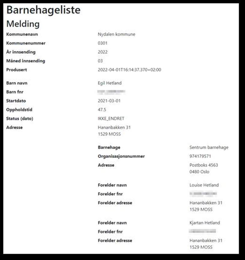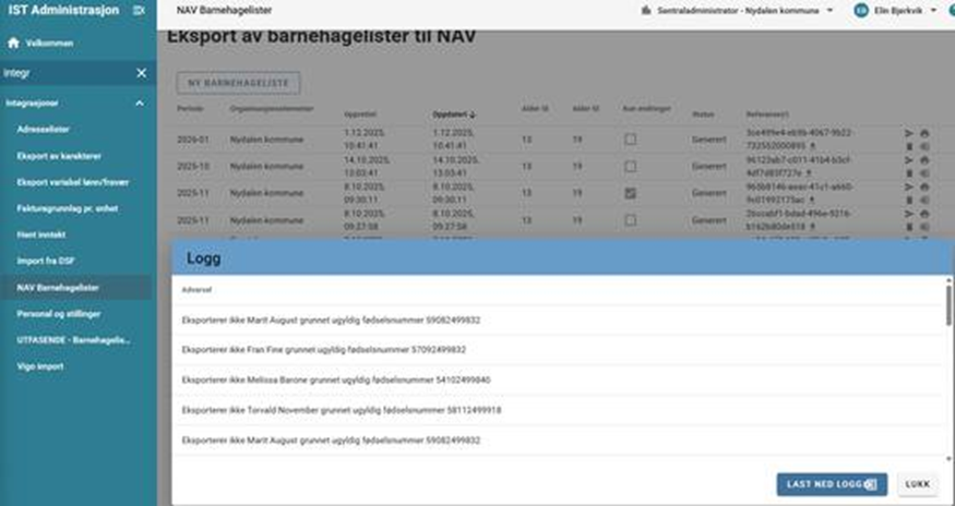 Barnehagelister genereres og du får opp en Logg hvor eventuelle feil framkommer. Dette kan være manglende organisasjonsnummer på en barnehage, manglende timeantall på en plassering eller barn med midlertidig fødselsnummer. Du må rette opp feilene som vises i loggen. Barn med midlertidig fødselsnummer må rettes/endres hvis barnet har fått et D-nummer eller et reelt fødselsnummer. Når feilene er rettet, må eksporten slettes og foretas på nytt.