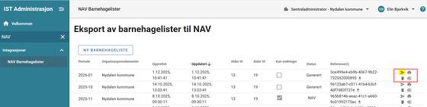 Helt til høyre kan du trykke på pil-ikonet Send barnehageliste til NAV for å sende inn barnehagelisten. Status endres til NAV. Om ønskelig kan du klikke på utskriftsikonet for å få frem listen i utskriftsvennlig format.
