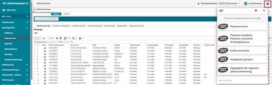 Du har tilgang til kontekstrelevante guider og håndbøker fra spørsmålstegnikonet øverst til høyre i løsningen. Guider som foreslås er relatert til menypunktet du står i: