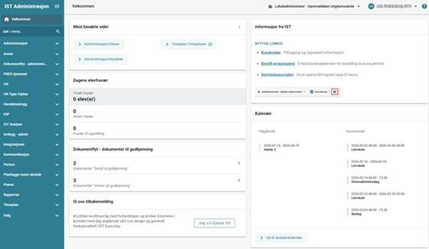 Sentraladministrator har ofte tilgang til flere roller slik som sentraladministrator og lokaladministrator på forskjellige nivåer og enheter/skoler. Vi anbefaler at du laster siden på nytt (F5) når du bytter mellom nivåer (sentraladm/lokaladm), og mellom enheter, for å være helt sikker på at visningen oppdateres iht. valgt enhet.