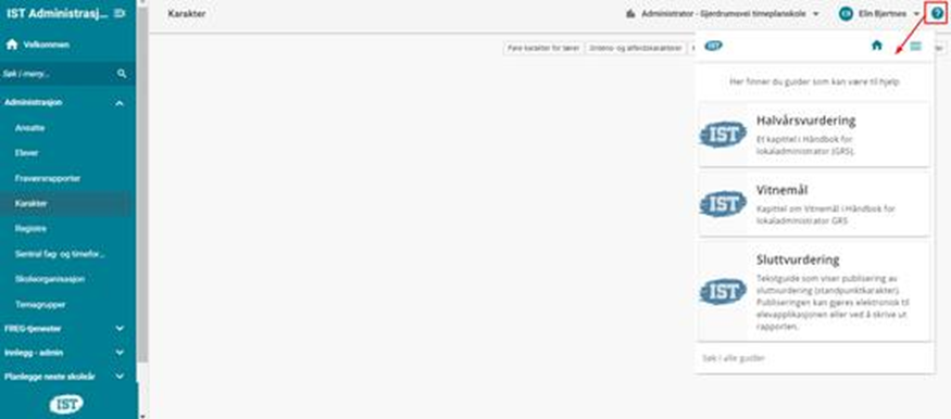 Du har tilgang til kontekstrelevante guider og håndbøker fra spørsmålstegnikonet øverst til høyre i løsningen. Guider som foreslås er relatert til menypunktet du står i: