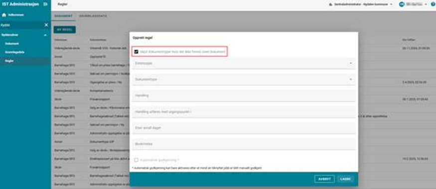 For hver dokumenttype i e-arkivet er det mulig å sette regler.
