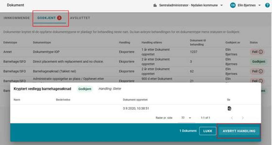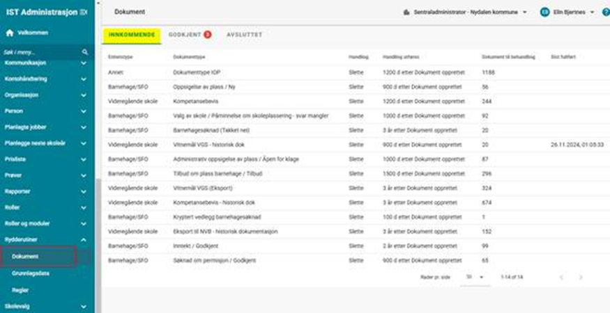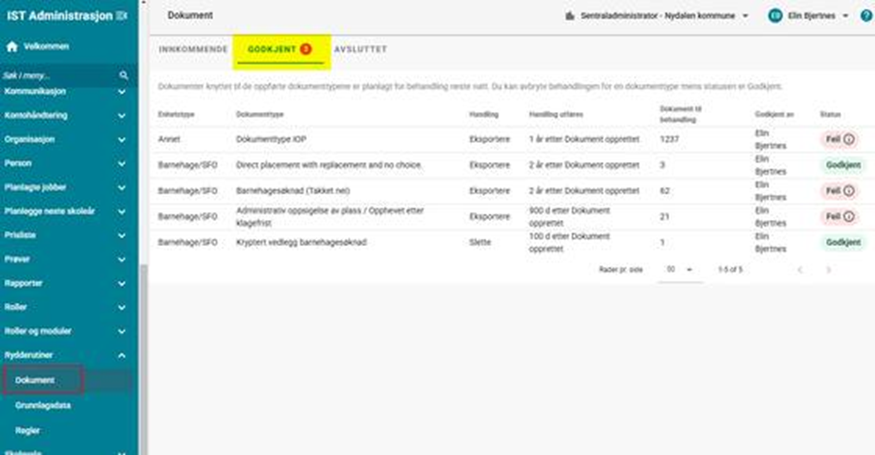 Denne fanen viser dokumenttyper som venter på handling, der administratorer kan starte eksport- eller sletteprosesser. Her vises kun dokumenttyper hvor det faktisk finnes dokumenter som ligger til behandling:
