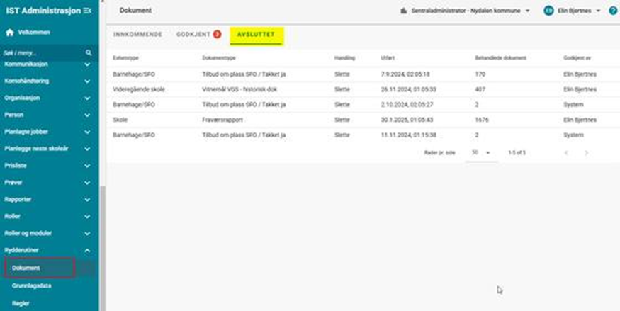 Her kan du se historikken til dokumenttyper som er behandlet. Det er mulig å se antall dokumenter som er behandlet, samt når en jobb ble utført og av hvem.