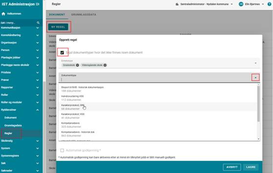 Automatisk godkjenning av en regel vil fjerne det manuelle steget i behandlingen av fremtidige dokument av denne dokumenttypen, og dokumenter som passerer tidsfristen og underlegges aktuell regel vil automatisk listes under fane Godkjent.