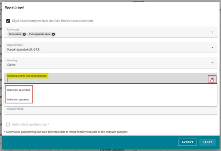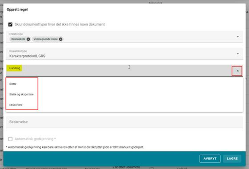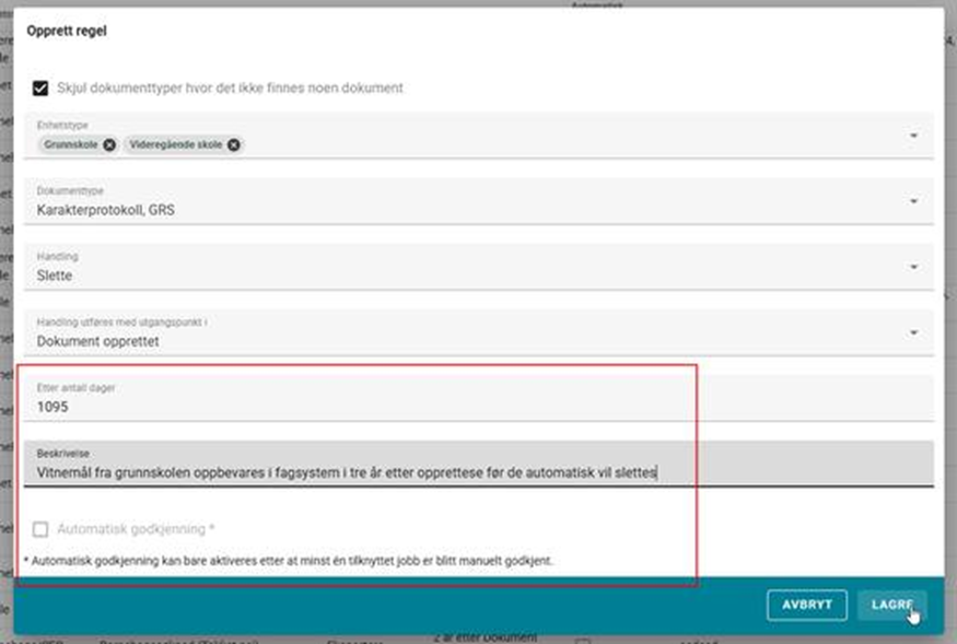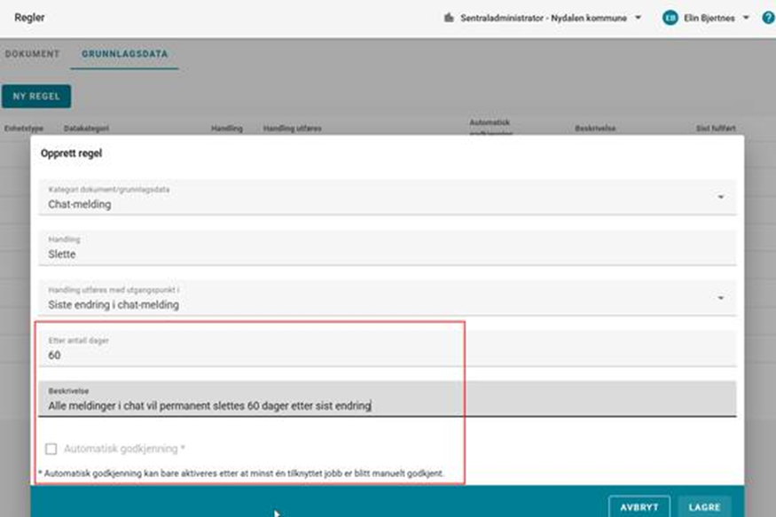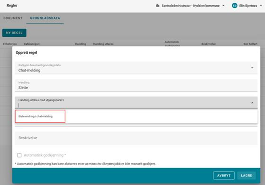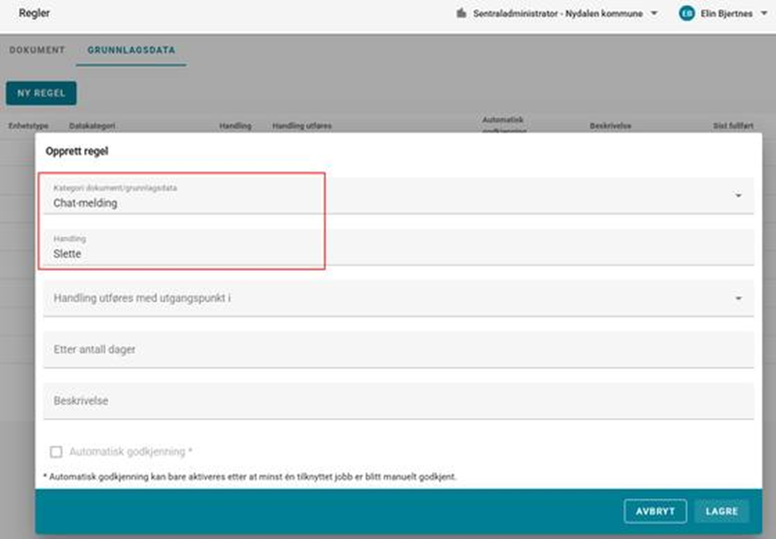 Handling utføres med utgangspunkt i: Utgangspunktet for når dato for handling skal beregnes Etter antall dager: Antall dager etter det beskrevne utgangspunktet (se over) dokument vil behandles Beskrivelse: Fritekstfelt med mulighet for å referere til rutinebeskrivelser, eller annen informasjon til brukere Automatisk godkjenning: Muligheten til å få systemet til å utføre handlinger basert på opprettede regler automatisk. Regelen må først godkjennes manuelt n gang før dette alternativet blir tilgjengelig