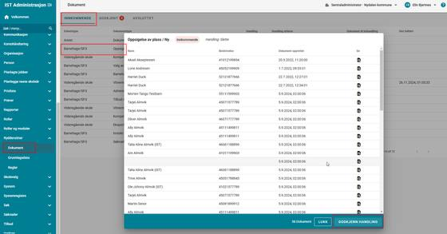 - Dokument fra administrasjonsløsningen for barnehage og SFO. Ulike typer hendelser knyttet til søknad og opptak genererer hendelser (dokumenter) som sendes til foresatte, men også lagres i e-arkivet. Dokument som genereres i administrasjonsløsningen for barnehage og SFO er tilgjengelige i grensesnittet for brukere med tildelte rettigheter under Verktøy >E-arkiv