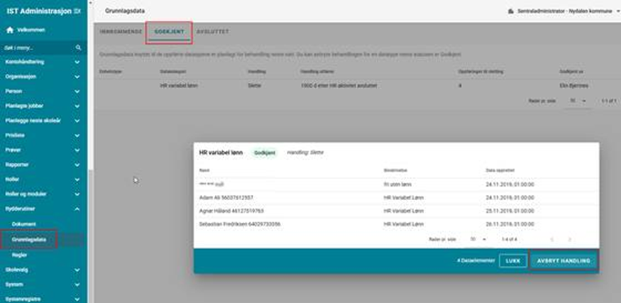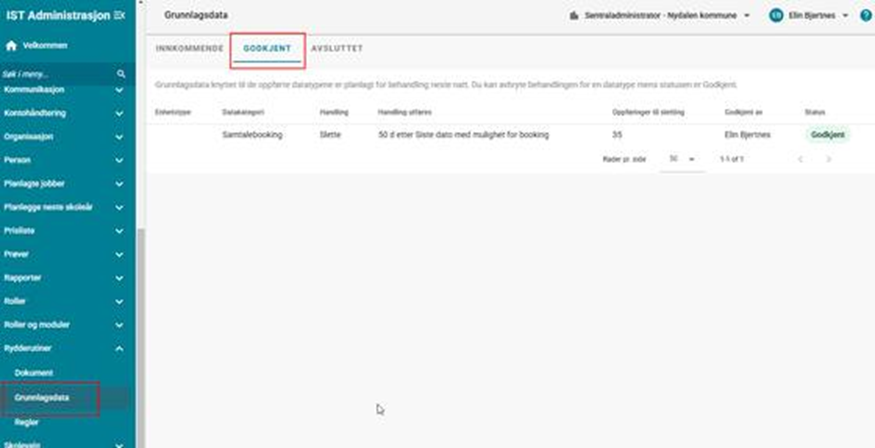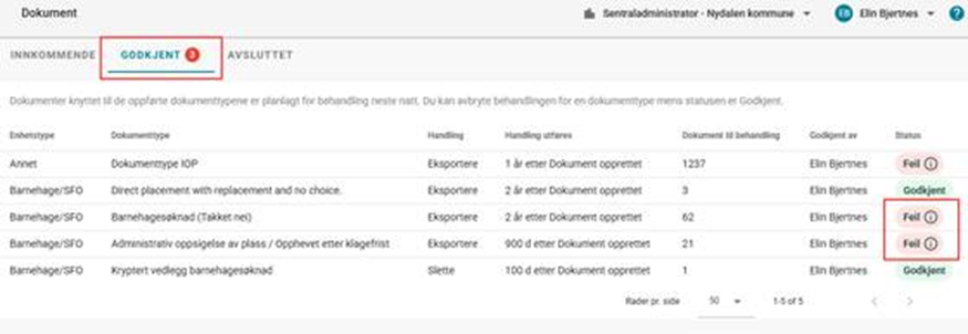 - Samsvarende datatyper vises for administratoren, som deretter godkjenner jobbene (dersom ikke automatisk godkjenning av jobben er lagt inn i gjeldende regel