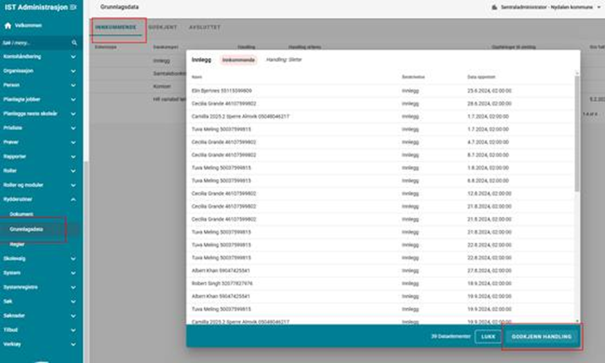 Under denne fanen vises datakategorier som venter på handling og som krever en manuell godkjenning. Her vises kun datakategorier hvor det faktisk finnes grunnlagsdata som ligger til behandling