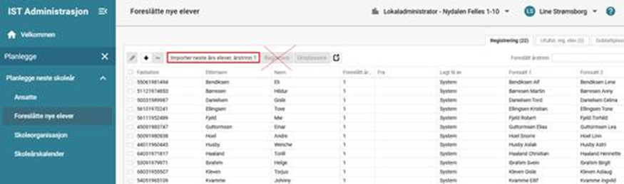Dersom dere har foretatt en ny innlesing fra folkeregisteret er det mulig å klikke på knappen "Importer neste års elever, årstrinn 1" en gang til. Som Lokaladministrator er det mulig å justere på de foreslåtte elevene, omplassere eller legge inn foreslått årstrinn om nødvendig.