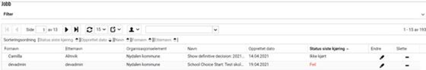Kjøringene vises under menypunktet Planlagte jobber > Mine planlagte jobber (dersom skolevalget er opprettet av deg). Dersom skolevalget er opprettet av en annen bruker vises jobben under menypunktet Planlagte jobber > Jobboversikt.