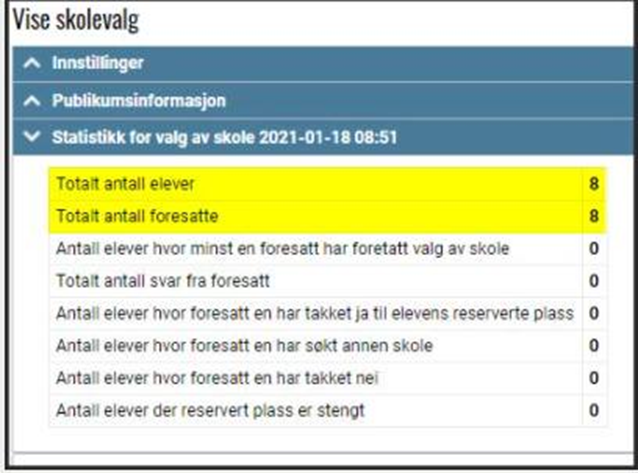 Under Skolevalg > Administrere skolevalg kan du se statistikk i forbindelse med antall inviterte elever og foresatte til et skolevalg. Dersom det ikke finnes noen registrert foresattrelasjon på en elev, vil kun eleven telles med i statistikken: