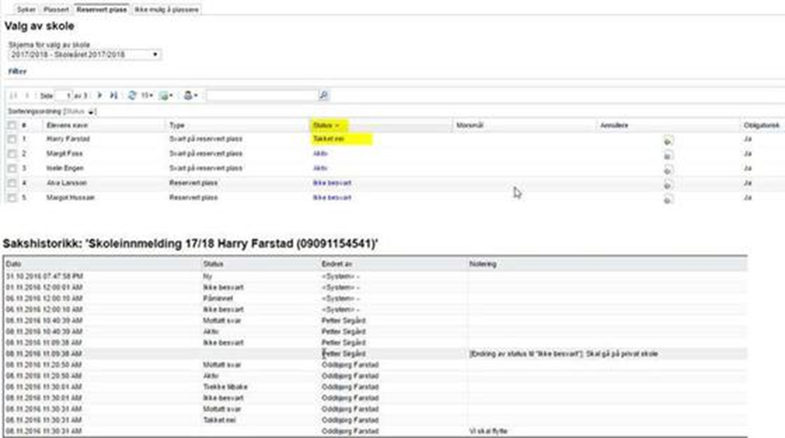Dette gir en oversikt over hvilke foresatte som har svart på tilbudet, og hvilke som ikke har svart. I utgangspunktet foreslår vi å plassere disse elevene på den reserverte skolen.