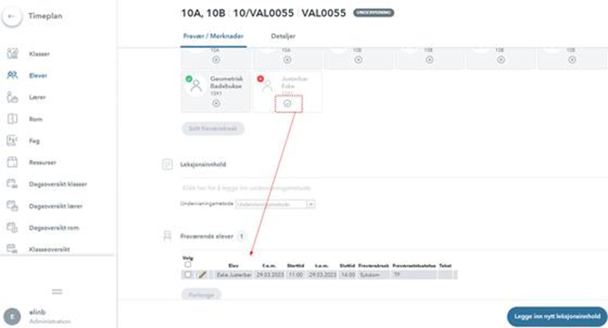 En leksjon kan bekreftes på samme måte i IST Timeplan ved enten å registrere fravær på minst en elev i leksjonen, eller ved å bekrefte at leksjonen er gjennomført uten fravær. Fraværet registreres, med utgangspunkt i en leksjon i timeplanen, på en eller flere elever: