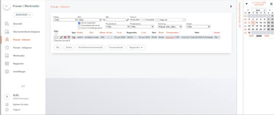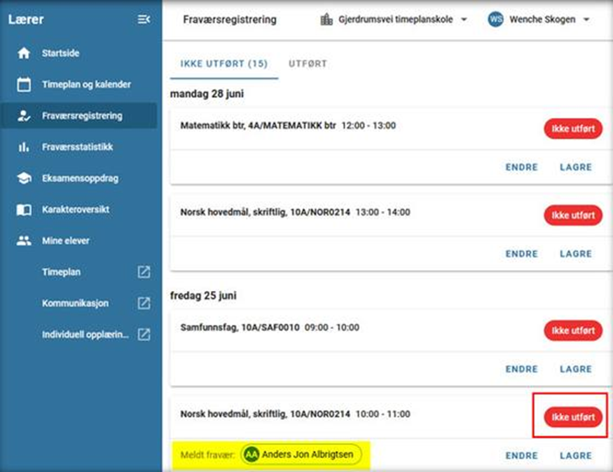 Når fraværet lagres endres status fra Kontrollere fravær til Fravær er kontrollert: