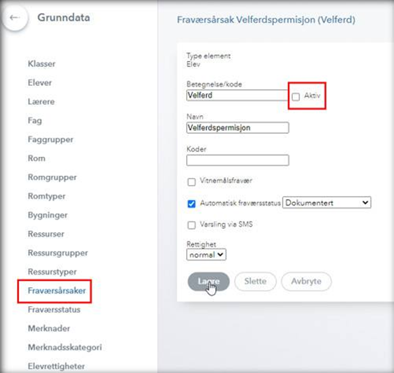 Fraværsårsaker finnes under Grunndata > Fraværsårsaker. Dersom det finnes årsaker i registeret dere ikke lengre ønsker å benytte, kan disse settes inaktive ved å fjerne Aktiv-haken: