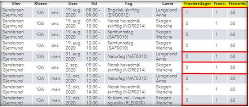 I oversikten Fravær - leksjoner er det også viktig å kjenne til hvordan dager, timer og minutter vises. I eksempelet nedenfor ser du fraværsleksjonene for elev Sandersen. Den 19. august og 12. oktober er det registrert fravær som strekker seg over alle hans leksjoner, derfor vises tallet 1 i kolonnen Fraværsdager bak en av leksjonene. Dette fraværet telles som heldagsfravær i relevante sammenhenger. 31. august og 2. september er det også registrert fravær, men da har eleven også leksjoner i sin timeplan hvor det ikke er registrert fravær. Dette fraværet telles og summeres som timefravær: