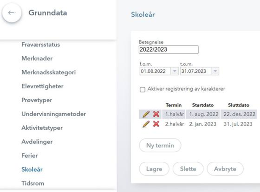 - Det må finnes to halvår i grunndataene. Gå til Grunndata > Skoleår > marker skoleår > klikk på endreblyant (se bildet under)