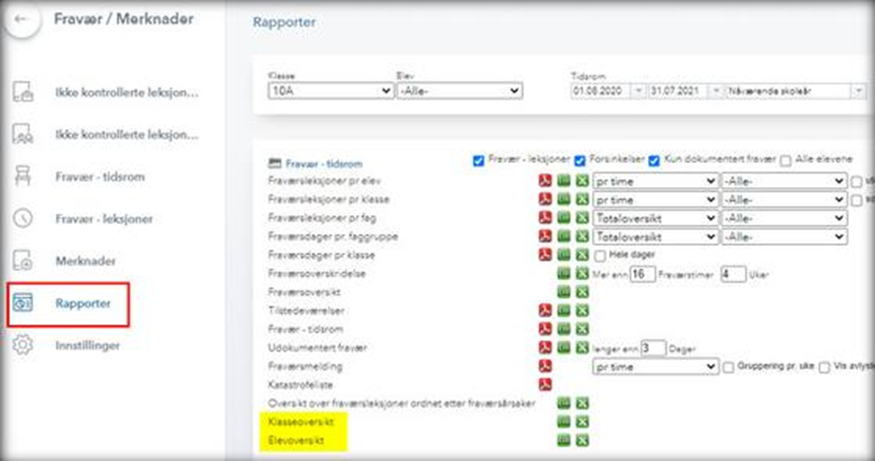 Under Fravær/merknader > Rapporter finnes det et stort utvalg av rapporter som kan hentes ut.