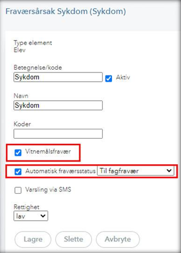 Vitnemålsfravær: Er det markert for Vitnemålsfravær vil fravær med denne fraværsårsaken overføres til elevkortet/vitnemål. Hvis det ikke er markert, vil det ikke overføres.