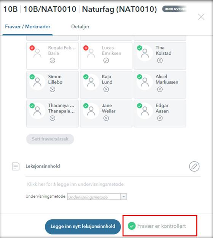 Dersom det ikke finnes fravær i en leksjon kan lærer bekrefte at leksjonen er kontrollert: