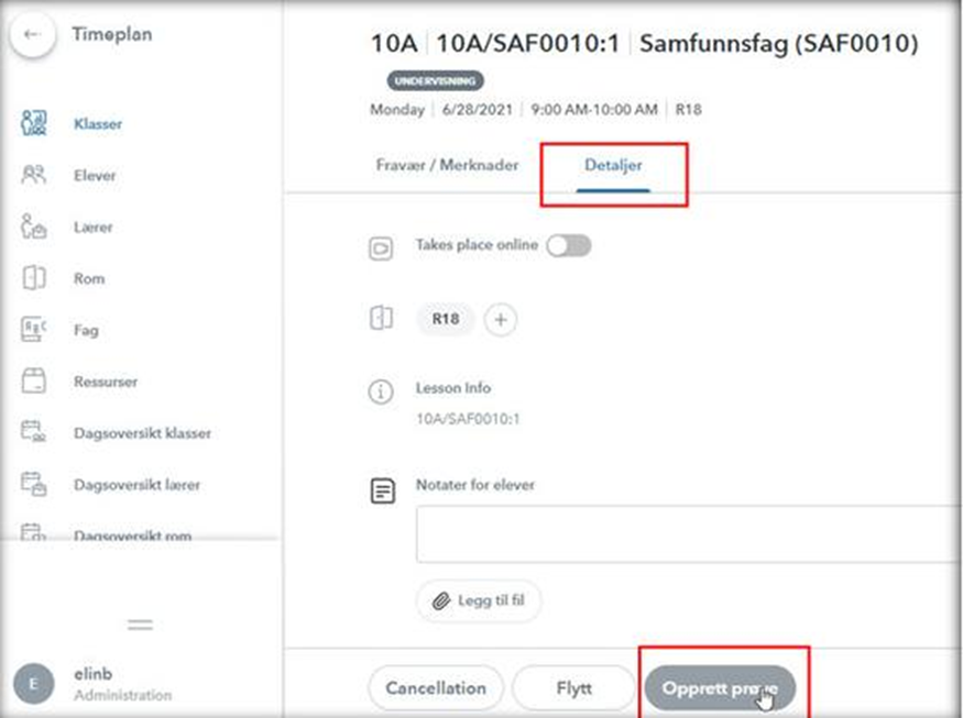 Det er mulig å registrere en prøve tilknyttet en leksjon i IST Timeplan. Klikk på leksjonen, og velg fanen Detaljer > Opprett prøve: