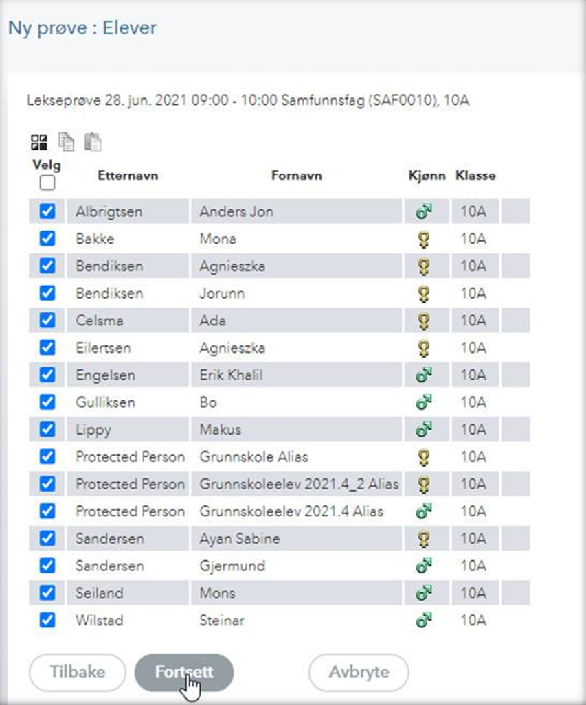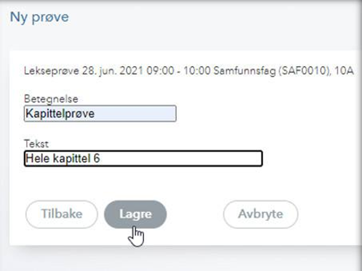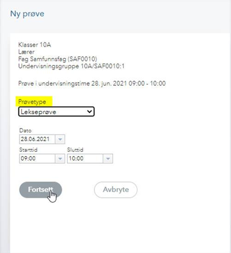 Videre legger du inn prøvetype, hvilke elever det gjelder samt informasjon om prøven: