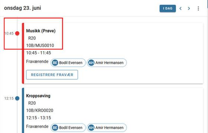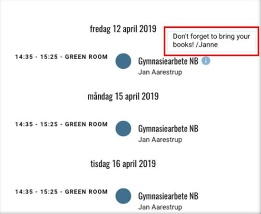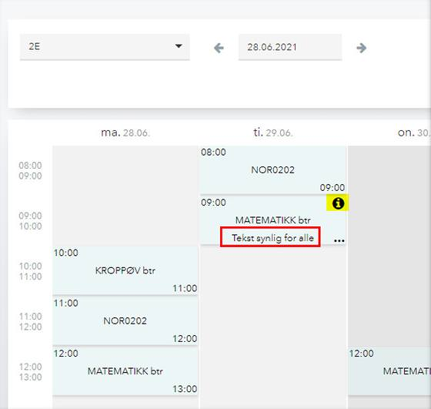Pr i dag vises ikke denne informasjonen i timeplanen direkte i lærer- eller elevapplikasjonen, men vi kommer til å bygge støtte for dette. Prototype for dette