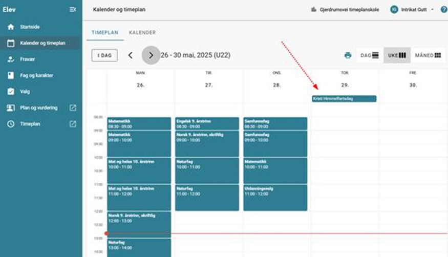 Du kan se timeplanen din for hele skoleåret. Velg om du vil se timeplanen vist som en uke, en måned eller dag. Bla til neste uke eller forrige uke med pilene over timeplanen